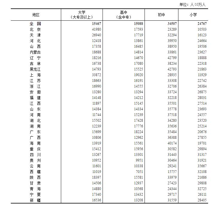 全国人口[2]中,拥有大学(指大专及以上)文化程度的人口为218360767人;拥有高中(含中专)文化程度的人口为213005258人;拥有初中文化程度的人口为487163489人;拥有小学文化程度的人口为349658828人(以上各种受教育程度的人包括各类学校的毕业生、肄业生和在校生)。与2010年第六次全国人口普查相比,每10万人中拥有大学文化程度的由8930人上升为15467人;拥有高中文化程度的由14032人上升为15088人;拥有初中文化程度的由38788人下降为34507人;拥有小学文化程度的由26779人下降为24767人。