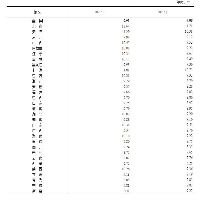 与2010年第六次全国人口普查相比,全国人口中,15岁及以上人口的平均受教育年限由9.08年提高至9.91年。