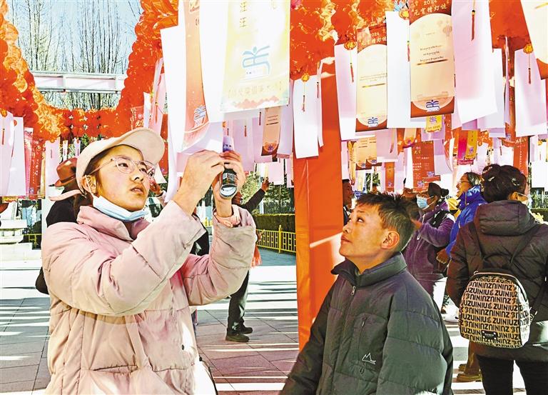 “年年有余(猜文学名词)”“春风桃李花开日(猜教育词语)”……步入公园,火红的灯笼下方,2100余份由国家通用语言文字和少数民族语言文字写成的谜面在风中轻舞摇曳。细看,字谜涉及面广,包含成语故事、传统民俗、旅游知识、历史人物等内容。