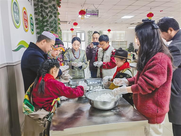 图③:昌都市卡若区各族干部群众欢聚在一起,包汤圆、庆元宵。