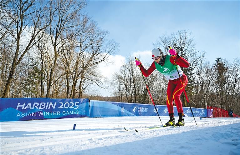 越野滑雪,是一项耐力和速度并重的运动,以滑雪板和滑雪杖为工具,滑行于山丘雪原的运动项目,自1986年首届亚冬会即被列为正式比赛项目,其赛道通常包括上坡、下坡和平地,分别占赛道总长1/3,选手需要使用传统式或自由式滑雪技巧进行比赛。