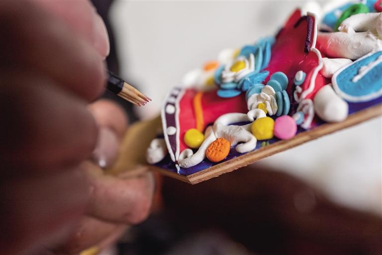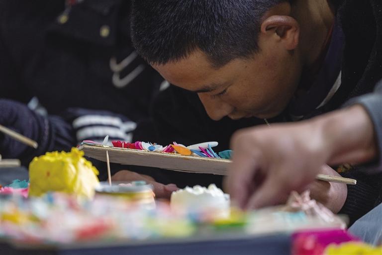 记者看到,捏酥油花的主要工序十分复杂。艺人们先制作盾形木板作为酥油花的“骨架”,支撑着整个作品的形态。当天,在几十平方米的出租屋内,大家围坐在墙边,面前摆放着调制好的各色酥油和一盆盆清水。艺人们盘腿而坐,进入“敷塑”阶段:他们在加工成膏状的乳白色酥油中揉进各色矿物质颜料,调和成五颜六色的油塑原料,接着熟练地捏取酥油在冷水中浸泡,然后用指尖不断揉捻、塑形,不时还用小木刀进行精细加工。随后,在做好的酥油花上微洒清水,使其更加坚固且璀璨夺目。在他们的巧手下,一块块酥油很快就变成了日月、花瓣以及猴、象、兔、鸟等各种形状。为了防止酥油融化,他们不停地将手放入冰水中降温。