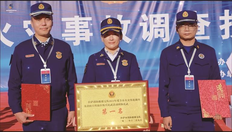 图为索娜白珍在拉萨市消防救援支队2022年度全市火灾事故调查及消防宣传岗位练兵比武活动团体比武中荣获第一名。