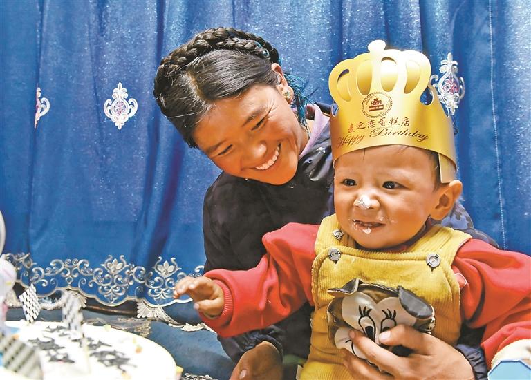 图为1月8日,母亲朋琼正在为地震宝宝次仁拉巴过生日。本报记者 旦增兰泽 摄