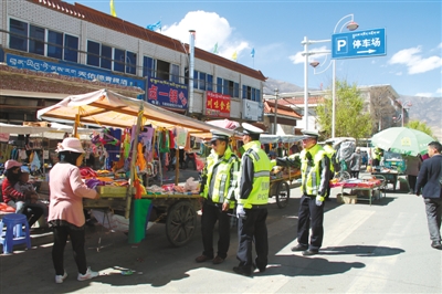 图为山南市公安局交警支队干警在上路执勤,确保道路交通安全。