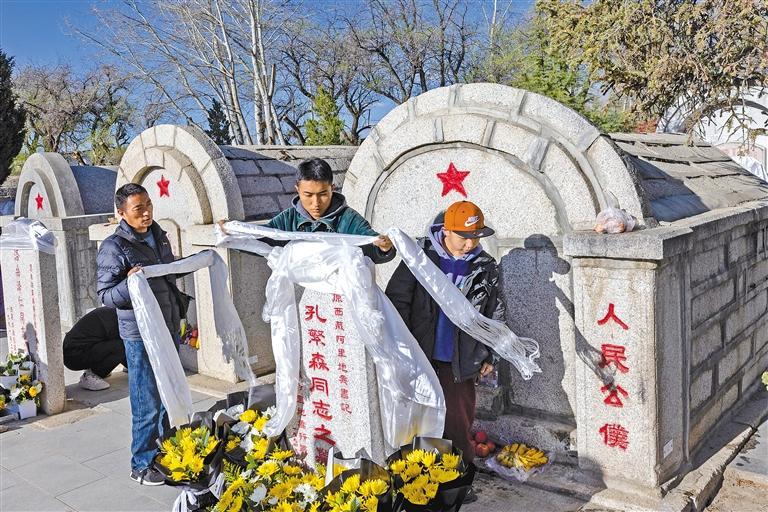 2日上午,自治区党委退役军人事务工作领导小组成员单位、退役军人代表来到拉萨烈士陵园,有序向烈士纪念碑敬献鲜花,鞠躬行礼,瞻仰纪念碑。随后,代表们细心地将墓碑上的灰尘拭去,手握朱红油漆笔,描摹革命先烈碑文,用一笔一画勾勒出对革命先烈的崇敬之情。
