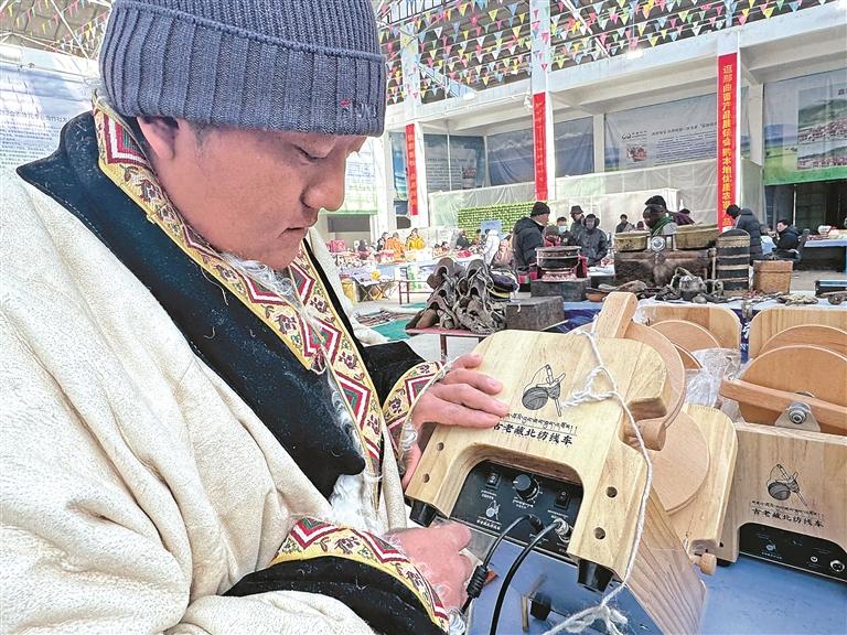 ▼展销商正在展示自己的新发明“古老藏北纺线车”。 本报记者 万靖 摄