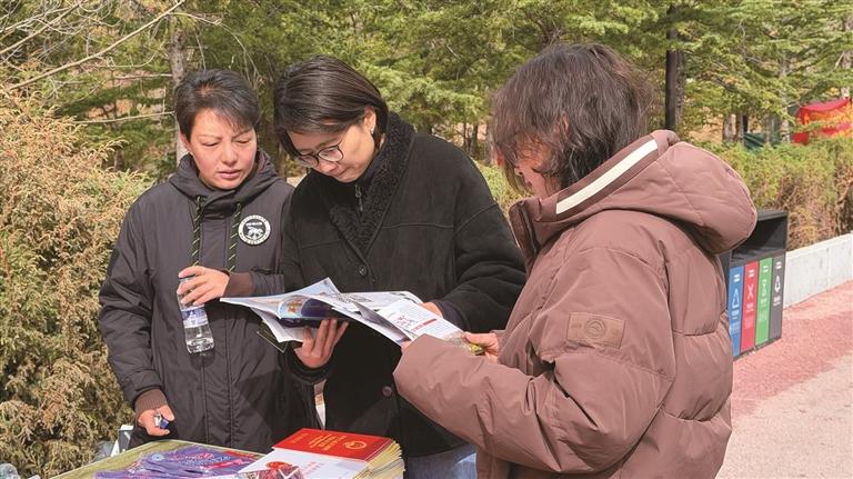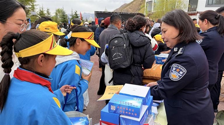 沿着公园步道,拉萨市人民防线办公室 、公安局、司法局、生态环境局等多个部门,依次设立了宣传展位。工作人员穿梭在人群中,耐心地向过往群众发放宣传手册,细致讲解网络安全、防火防灾、生态保护、防范诈骗等贴近日常的安全知识,路过的市民纷纷驻足聆听、主动咨询,时不时拿起宣传资料翻阅。