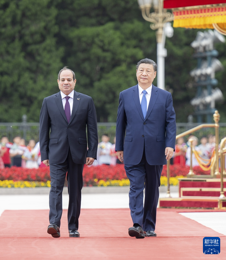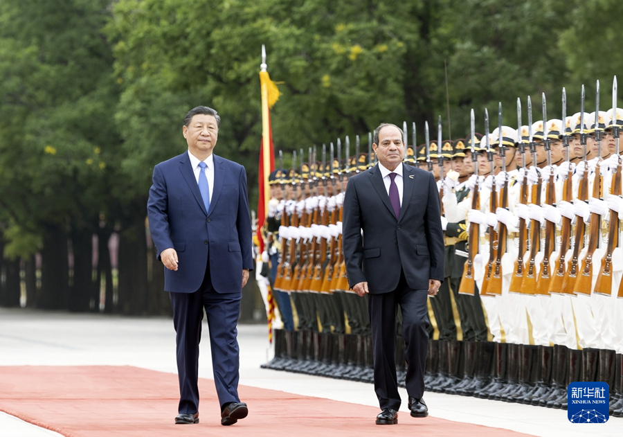 5月29日下午,国家主席习近平在北京人民大会堂同来华出席中国-阿拉伯国家合作论坛第十届部长级会议开幕式并进行国事访问的埃及总统塞西举行会谈。这是会谈前,习近平在人民大会堂东门外广场为塞西举行欢迎仪式。