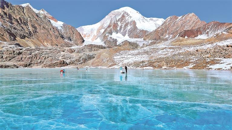 在友人的提议下,我仰面躺下。刹那间,刺骨的寒意在瞬息间由脊背侵入,高原的阳光慷慨地洒落全身,身体仿佛悬浮于冷与热、天与地、刹那与永恒的交界,恍惚间,冰面澄澈的深处,似有熟悉的身影含笑走来,衣袂间拂动着远古的风。一切归于遗忘,让人分不清这是古是今。