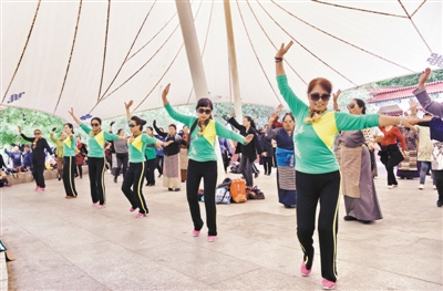 8点,天蒙蒙亮,日出即将唤醒清晨,大地呈现出安详平和的景象。而宗角禄康公园早已是一片热闹,有的人在跳有氧操、有的人在散步、有的人在练太极……