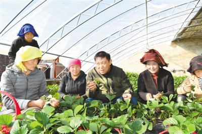 堆龙德庆区净土产业投资开发有限公司草莓种植技术员正在手把手教授常木村村民草莓种植技术。