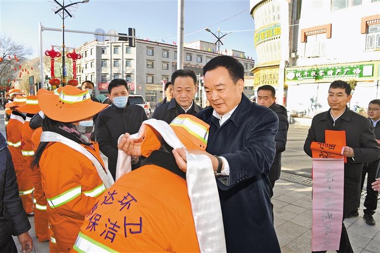 一个祥和欢乐的节日,离不开坚守岗位的劳动者默默奉献。“老家在哪里、家里有几个人”“年货备齐了吗”,王君正来到拉萨市朵森格中路亲切询问在严寒中劳作的环卫工人,送去新春的诚挚祝福。王君正指出,广大环卫工人多年来发扬“宁愿一人脏,换来万家净”的环卫精神,用勤劳双手美化了城市,为广大居民创造了清洁的生活环境,各级各部门要一如既往关心和重视环卫工作,维护环卫工人的合法权益,为环卫工人创造更加良好的工作环境。全社会要用行动汇聚温暖,让崇尚环卫精神、关爱环卫工人、尊重环卫成果的意识蔚然成风,让城市更优美、更和谐、更文明。