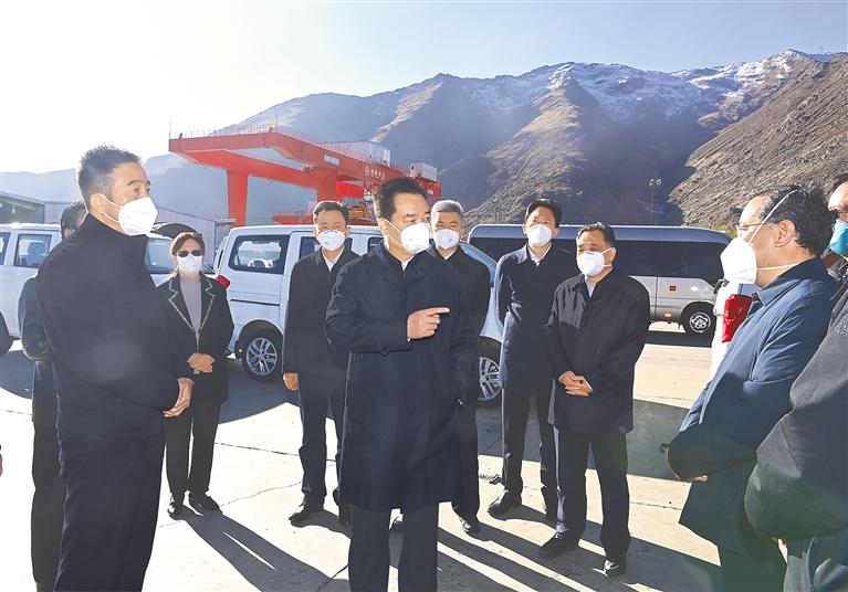 11月10日上午,自治区党委书记王君正在拉萨市调研疫情防控和复工复产工作。这是王君正在拉萨西货站实地察看民生物资运输保障情况。