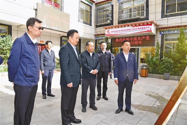 6月30日上午,自治区党委书记王君正深入拉萨市城关区、达孜区,调研基层党组织建设工作并看望慰问老党员。这是王君正在策门林社区听取党建引领基层治理情况介绍,仔细询问便民服务办理情况。