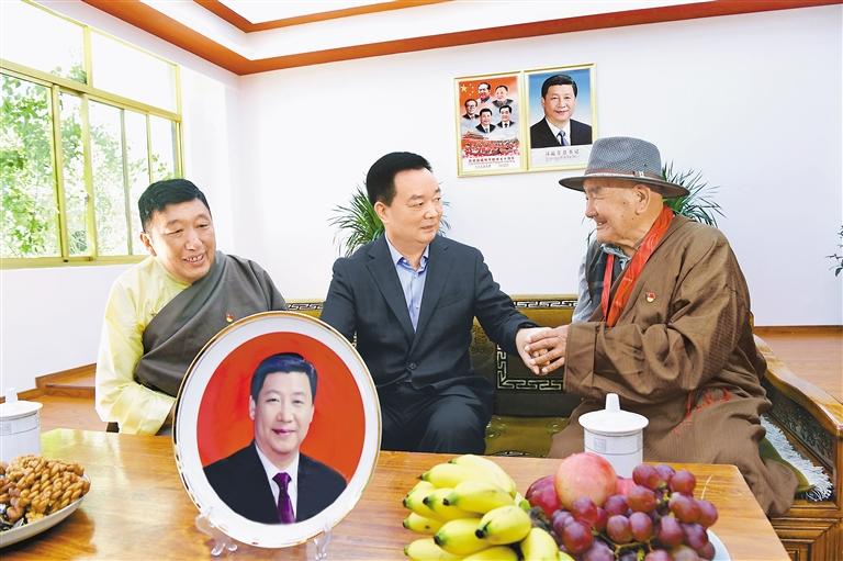 6月30日上午,自治区党委书记王君正深入拉萨市城关区、达孜区,调研基层党组织建设工作并看望慰问老党员。这是王君正与老党员巴桑次仁亲切交谈,向他致以节日问候和诚挚祝福。