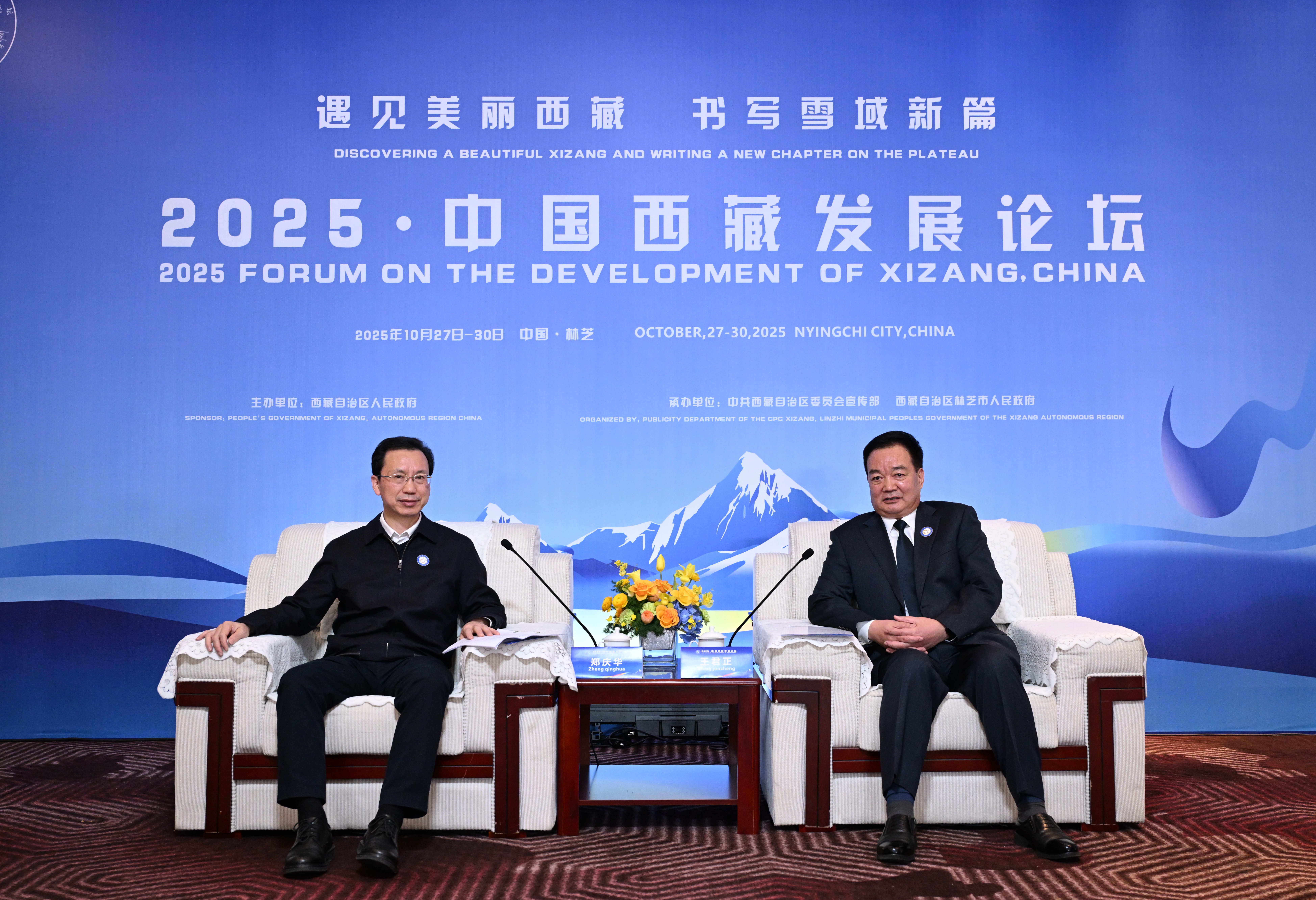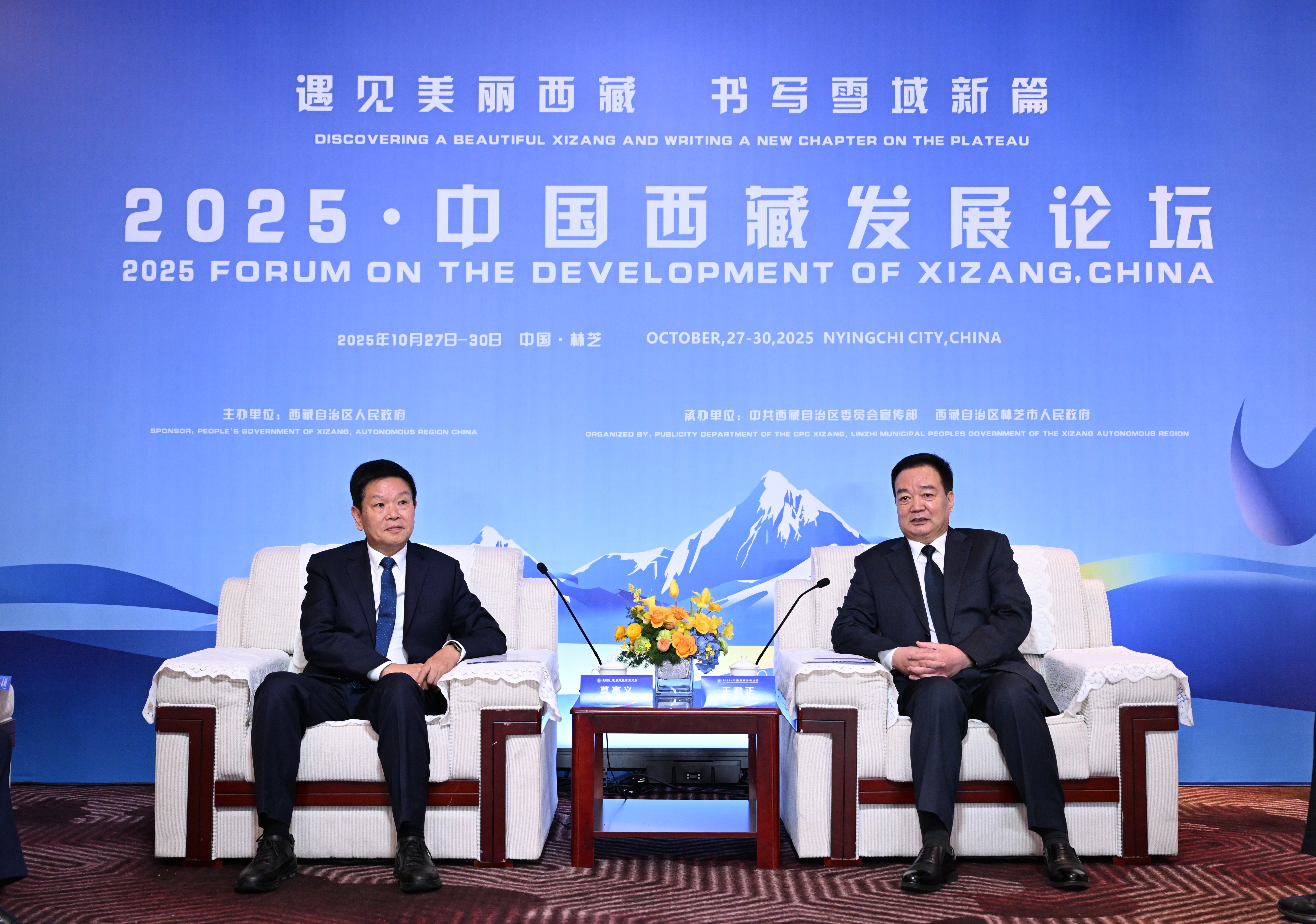 10月28日至29日,自治区党委书记王君正在林芝先后与参加2025·中国西藏发展论坛的嘉宾和国内专家学者代表座谈。这是王君正与同济大学党委书记郑庆华座谈。本报记者 旦增西旦 摄