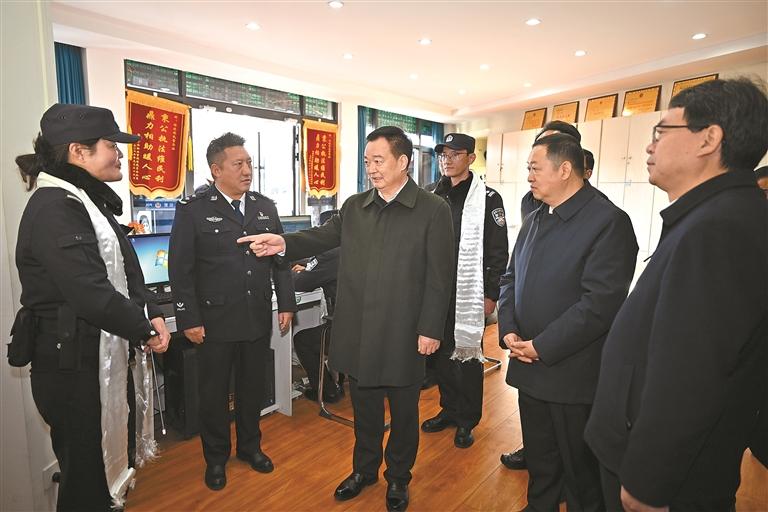 2月12日,自治区党委书记王君正在拉萨市看望慰问奋战在一线的基层政法干警、消防指战员、寺管会干部,代表自治区党委向大家致以新春祝福。这是王君正在明珠便民警务站看望慰问基层民警并了解相关工作。本报记者 旦增西旦 摄