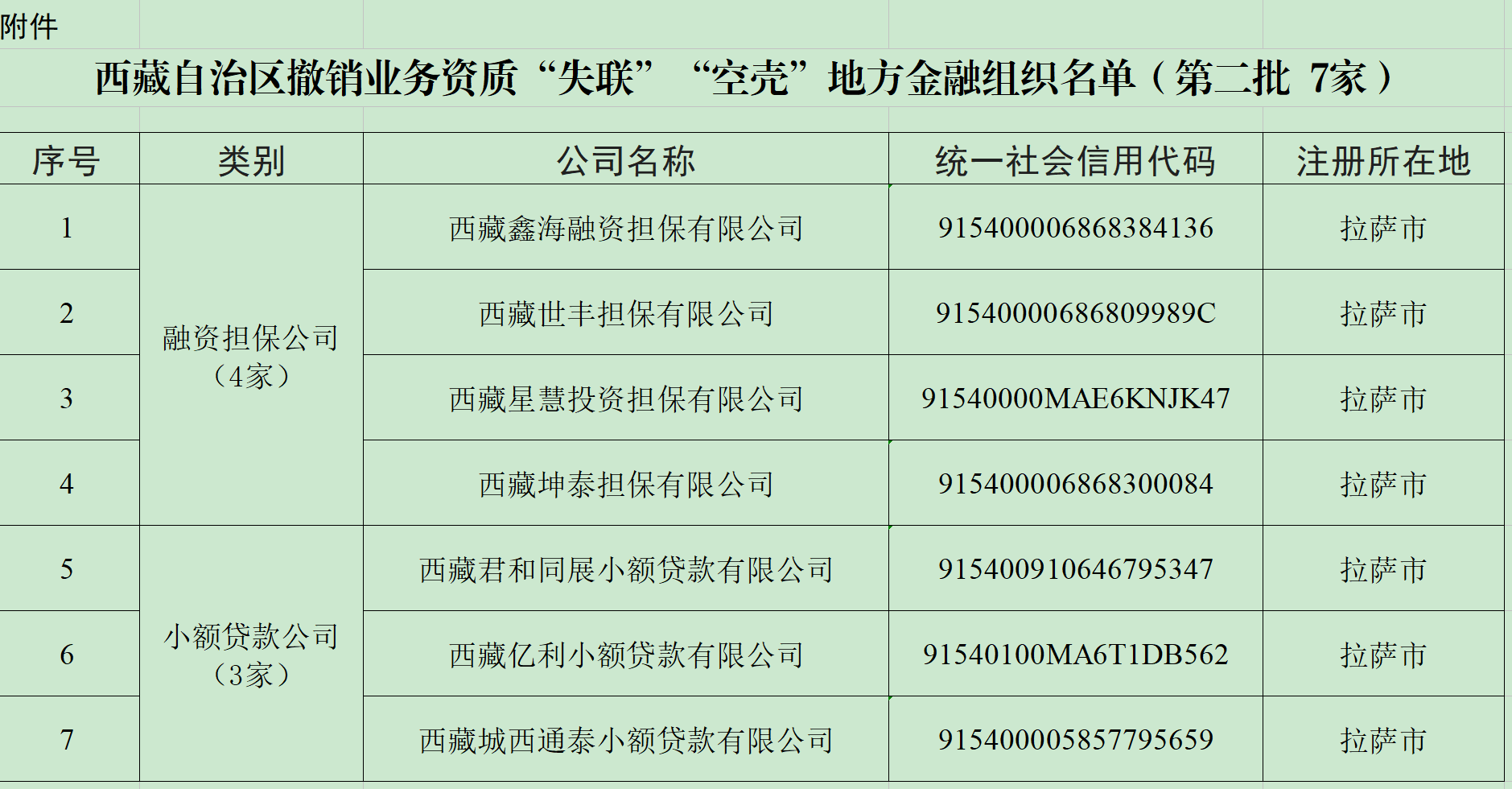附件:西藏自治区撤销业务资质“失联”“空壳”地方金融组织名单(第二批 7家)
