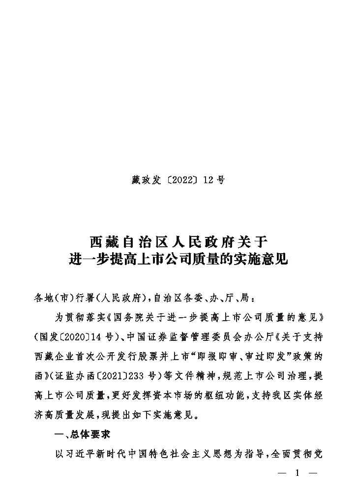 西藏自治区人民政府关于进一步提高上市公司质量的实施意见