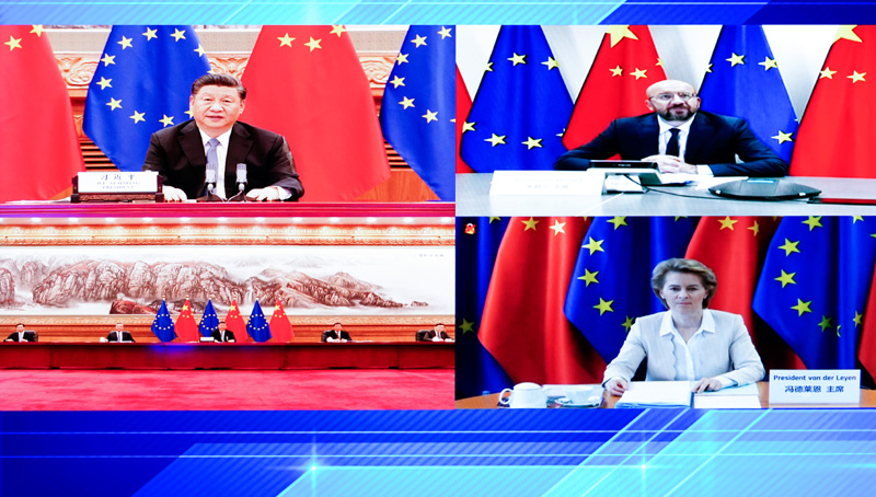 国家主席习近平22日晚在北京以视频方式会见欧洲理事会主席米歇尔和欧盟委员会主席冯德莱恩。