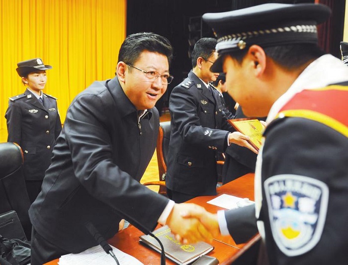 拉萨市委副书记、市长、市委政法委书记张延清为受表彰的先进单位和个人颁奖。 平措旺堆 摄