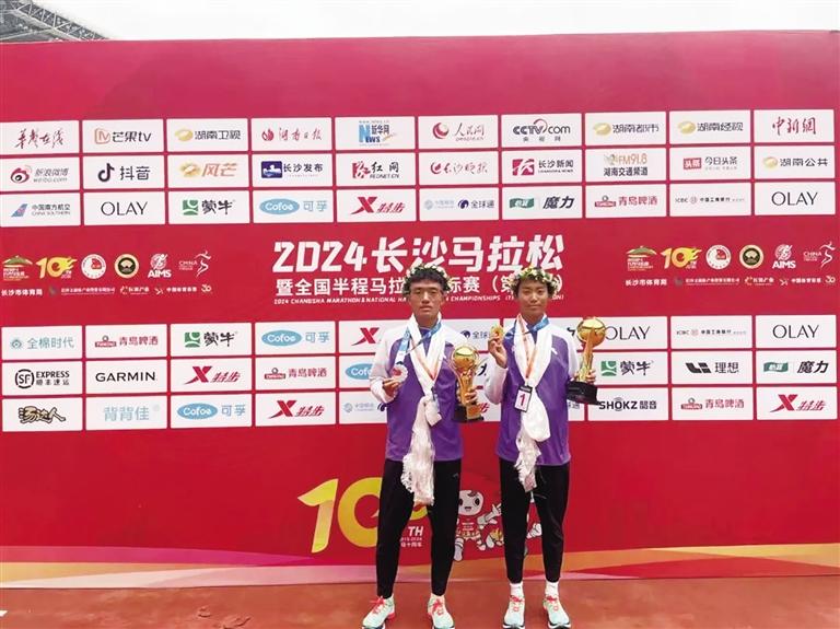 2024全国半程马拉松锦标赛(第四站),央增拉姆(右)获半程马拉松女子组冠军,顿珠次仁(左)获半程马拉松男子组亚军。图由自治区体育局提供