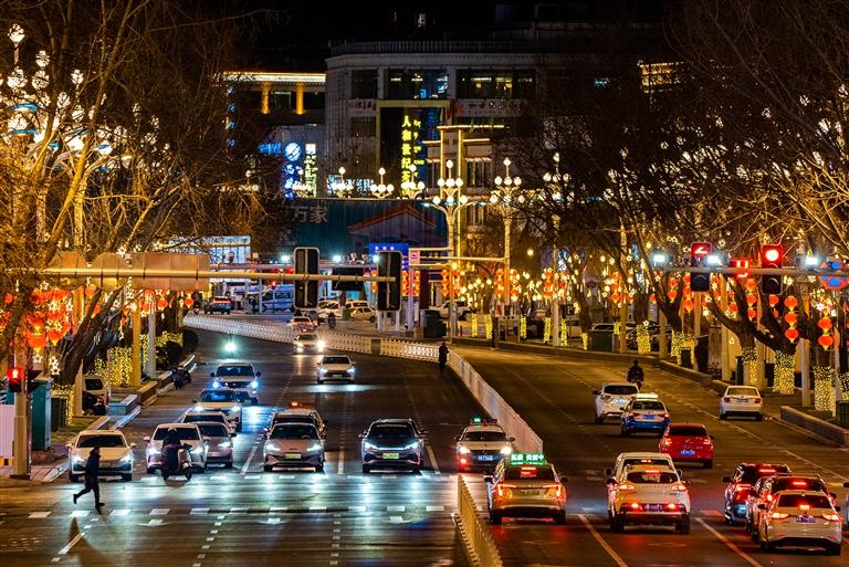 漫步在林廓东路北段、民族南路、北京中路……大街小巷都披上了藏历新年的盛装,新年元素琳琅满目,处处洋溢着节日的气息。夜幕降临,华灯初上,道路两侧树上的灯笼和灯串开启亮灯模式,街道在灯光的交相辉映下,传递出浓郁的年味,流光溢彩的街景也让拉萨更显活力,不时有人用手机定格此刻的画面。