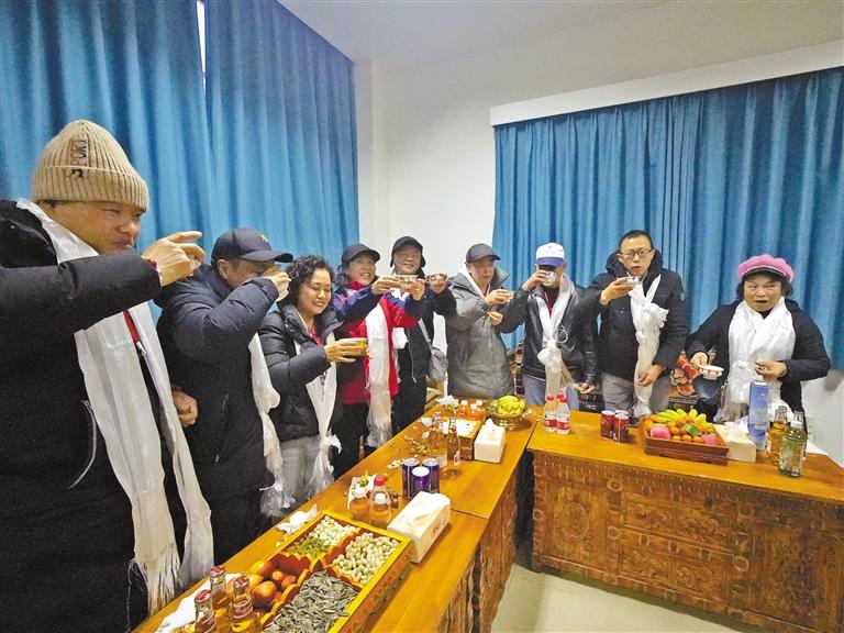 图③:“古突”之夜,“走进雪域边陲 体验藏历新年”旅游团游客在玉麦以酥油茶代酒,祝贺藏历新年,祝福祖国繁荣昌盛。