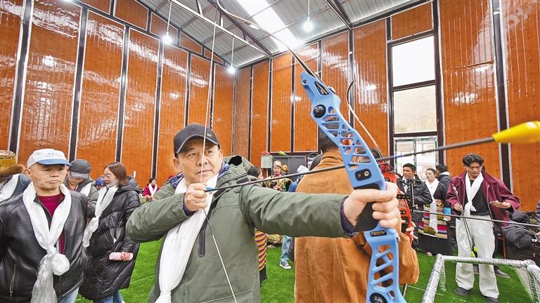 图④:游客在扎日镇体验当地传统体育项目——响箭。