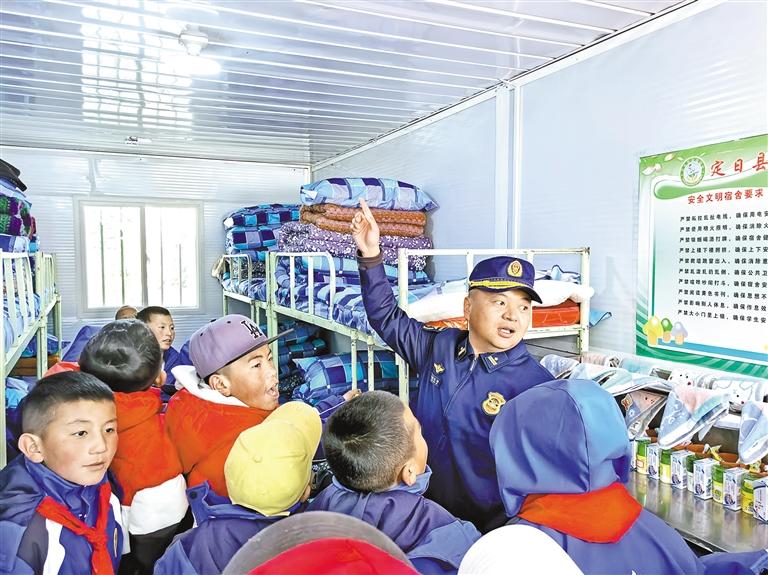 日喀则市消防救援支队宣传员向地震受灾县师生讲解板房安置点的火灾隐患和防范措施。 本报通讯员 肖暄 摄