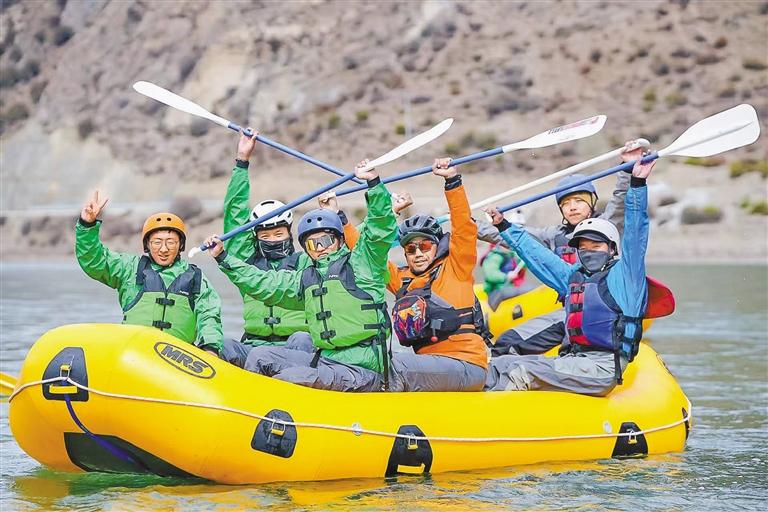 “五一”假期,墨竹工卡唐加乡骑漂行活动举行,近30位户外运动爱好者体验了13公里骑行、4公里徒步、10公里漂流等项目。图为户外运动爱好者体验10公里漂流项目。本报记者 鹿丽娟 摄
