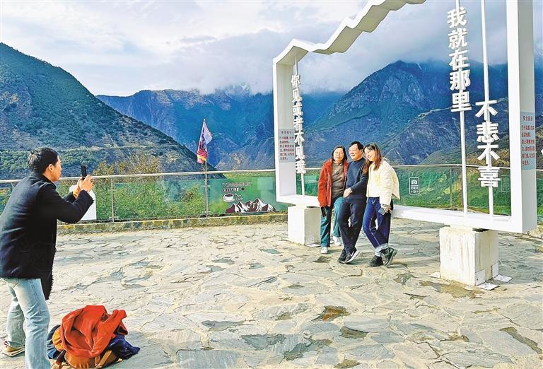 游客在雅鲁藏布江大拐弯观景台拍照留念。本报记者 白玛泽旺 摄