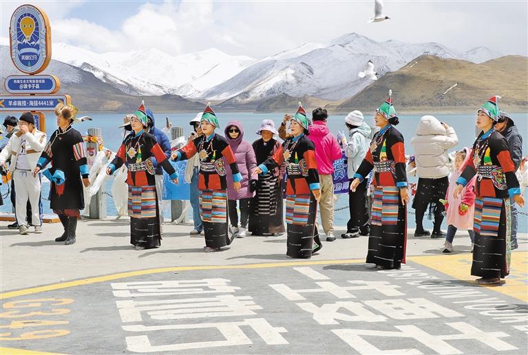 游客在羊卓雍错景区欣赏特色民族歌舞表演。本报记者 丹增平措 摄