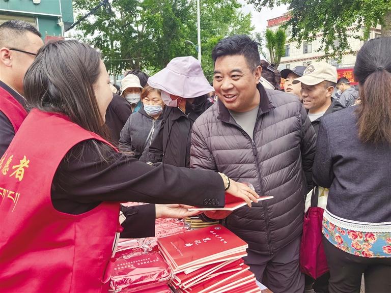 工作人员给社区居民发放安全宣传资料。记者 张雪芳 摄
