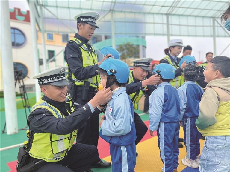 拉萨交警为孩子们示范如何佩戴安全头盔。拉萨交警提供