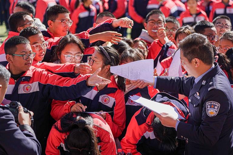 我区“开学第一课”网络普法进校园活动中,民警为学生发放普法宣传知识手册。记者 贡曲罗杰 摄