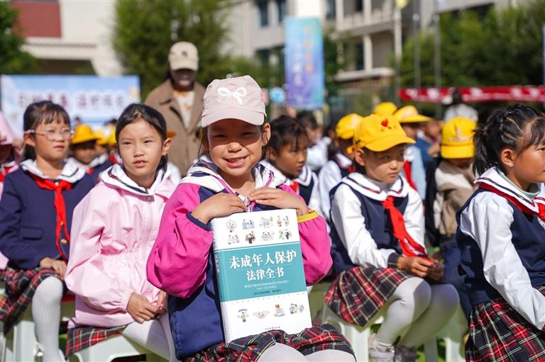 西藏自治区2025年“送法进校园”系列普法宣传示范活动中,孩子们领到《未成年人保护法律全书》。记者 贡曲罗杰 摄