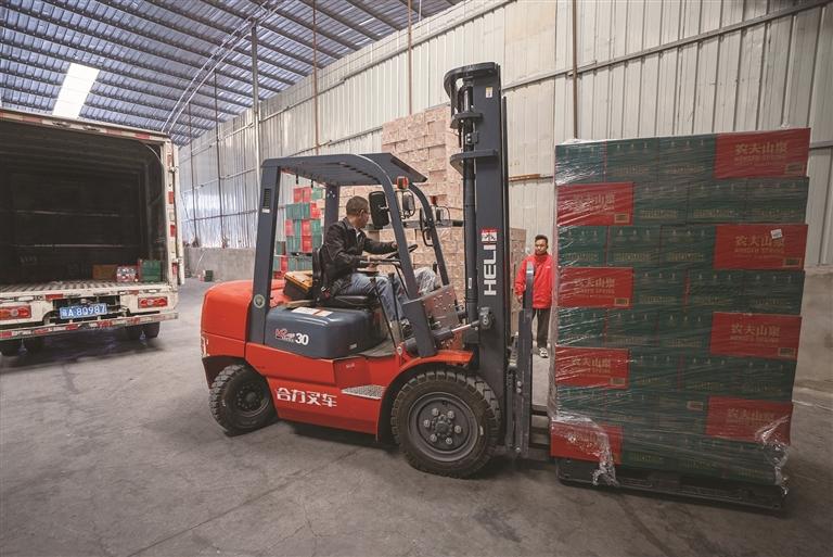 近日,记者来到西藏圣城商务服务有限公司,只见3个仓库里农夫山泉包装箱码放得整整齐齐。罗绪坤正带领团队用叉车装货,一辆辆货车接连驶出,一派繁忙景象。“以前都是人工搬运,今年公司用上了智能搬运设备,这可比以前省力多了。”罗绪坤介绍道。