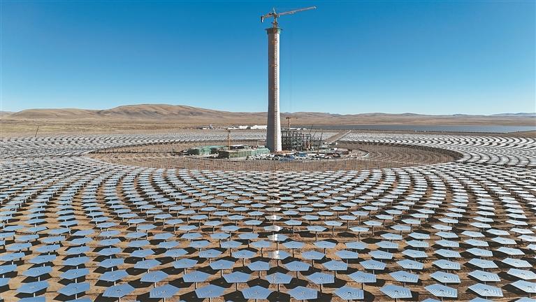 记者在施工现场了解到,该吸热塔配置近1.6万台定日镜,总采光面积超80万平方米,工人正在紧张有序安装,计划于明年3月搭建完毕,塔顶吸热器拟于明年4月安装完成。届时一座座五边形的定日镜,就像草原上的一朵朵“向日葵”,实时追踪太阳位置,将阳光反射至中央吸热塔,呈现“万镜朝阳、塔耀雪山”的壮丽景象,如同科幻电影里的场景,成为藏北高原上一座“亮眼”的绿色能源地标。