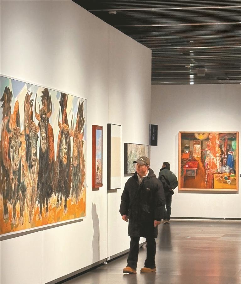 图为参观者在油画前驻足观赏。