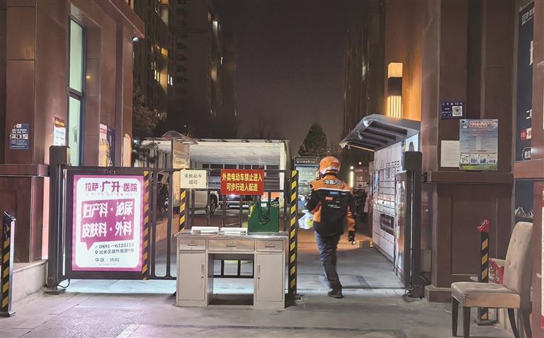 “你好,你的外卖到小区了,马上给你送过来。”近日,记者来到拉萨市城关区东城一号小区,只见小区门口挂着红色标示牌,上面写着“外卖电动车禁止进入,可步行进入配送”。记者观察的十来分钟内,多名外卖员在小区门口停好电动车后,提着外卖快步走进小区,朝目标楼栋赶去,也有几名业主在大门口外的桌子上翻找自己的外卖。小区业主索女士告诉记者,“我家住在9栋,离小区大门有点远,以前外卖员骑车送餐很快,现在天气冷,外卖提在手上送过来都凉了。”