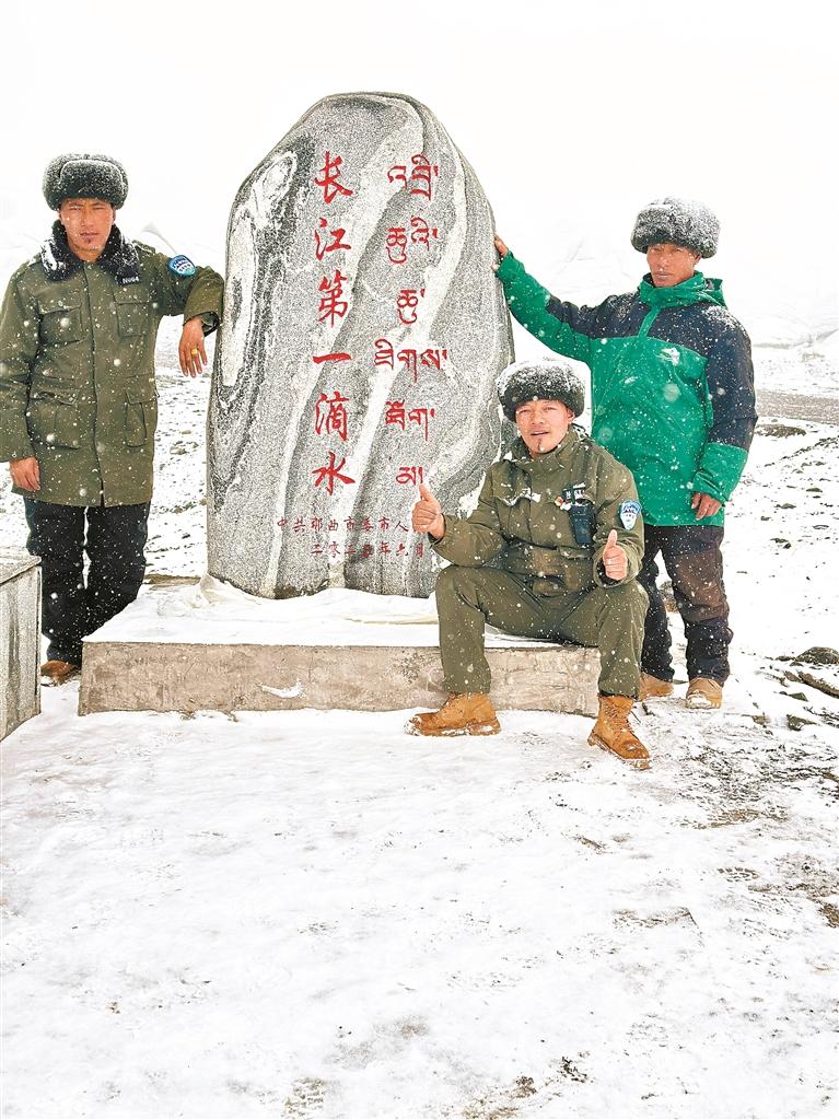图为玛鲁古塘管护站工作人员巡护时在长江第一滴水石碑前合影。仁青加措 提供