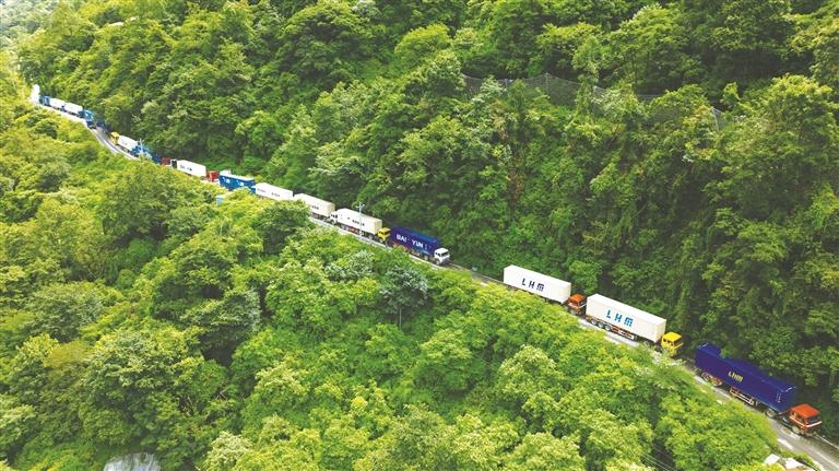 ◀满载出口货物的车辆有序候检。通讯员 蒋美灵 摄