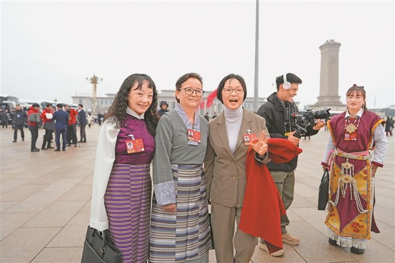 图为来自西藏的白玛措代表(左)、尼珍代表(中)与来自浙江的韩喜球代表(右)合影。本报记者 琅珍 摄