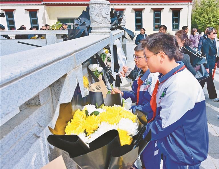 拉萨市第八中学学生在拉萨烈士陵园革命烈士纪念碑前献花。本报记者 王敏 摄