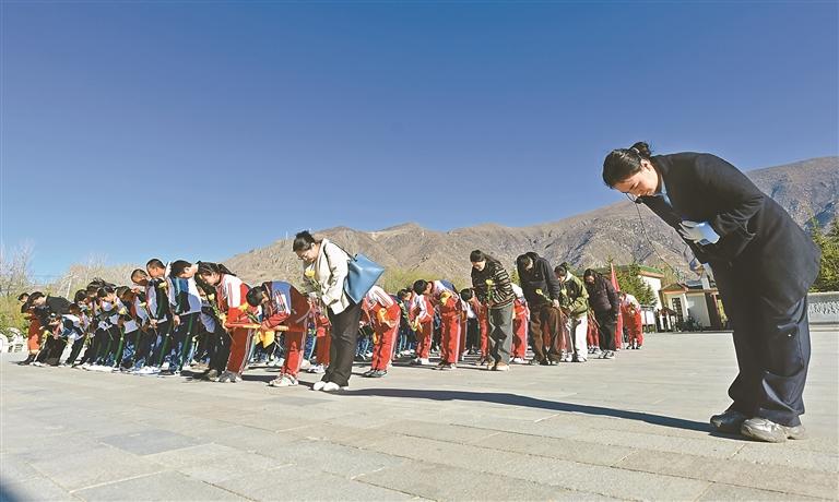 拉萨市中小学生代表在拉萨烈士陵园革命烈士纪念碑前鞠躬致敬。本报记者 唐斌 白玛泽旺 摄
