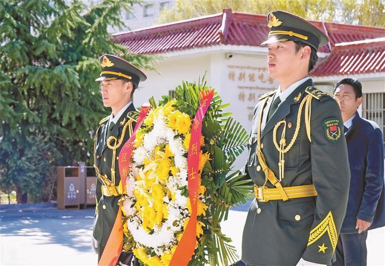 西藏职业技术学院国旗护卫队队员为谭冠三将军墓敬献花篮。本报记者 索朗旺久 摄