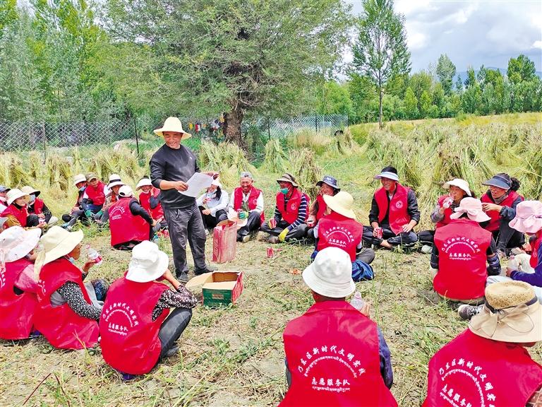 图为乃东区新时代文明实践志愿服务队在田间地头学习强农惠农政策。