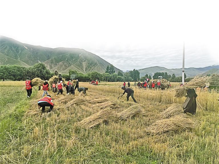 图①:桑日县奴卡社区开展“助力秋收送温暖 党员先锋在行动”活动。图为党员及志愿者深入田间助农抢收秋粮。